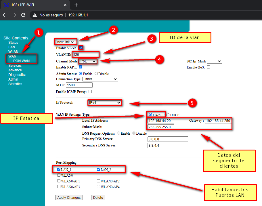 1 Asignar IP Estatica WAN a la ONU.