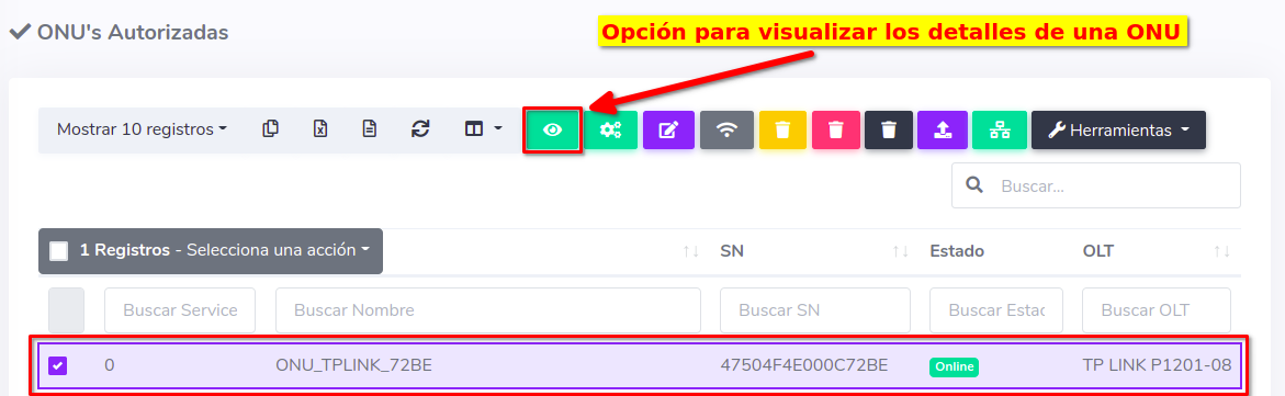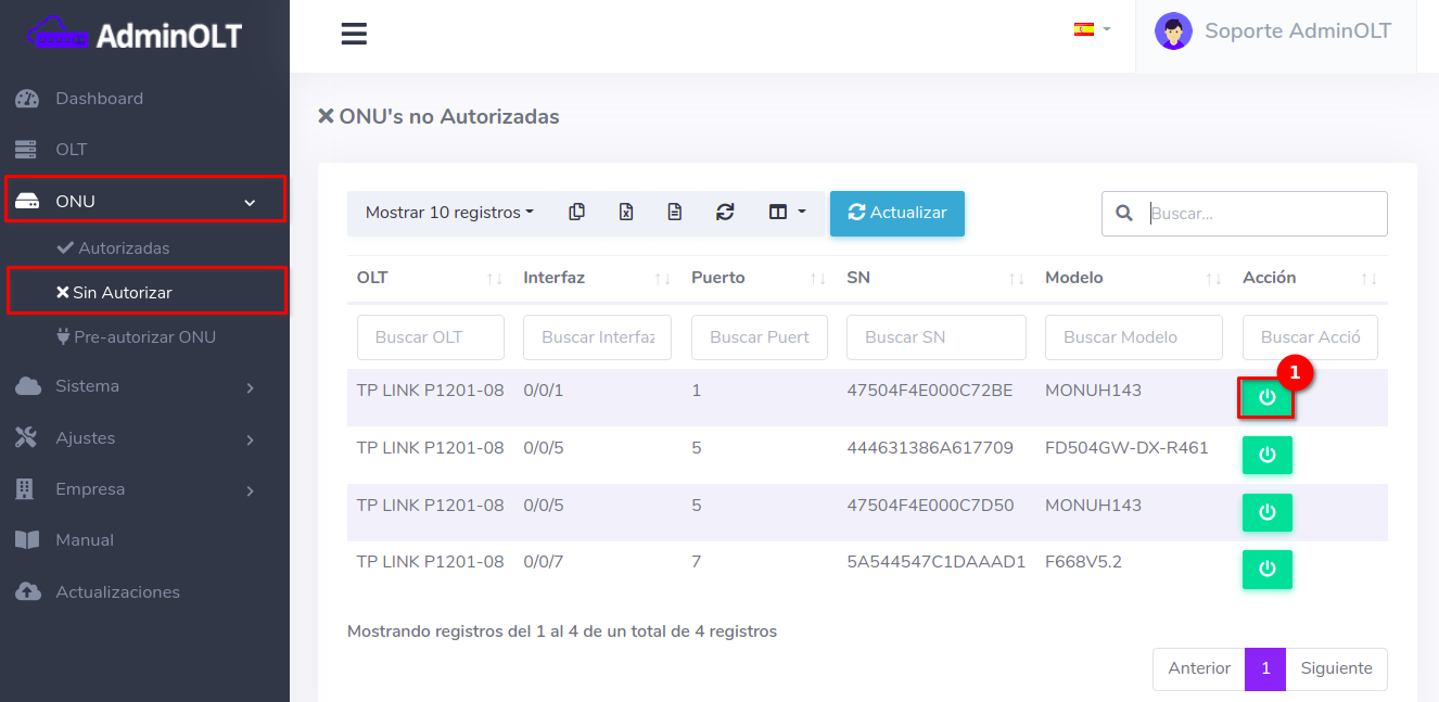 1Para ver los dispositivos que aún no han sido autorizados, debemos dirigirnos a la sección ONU > Sin Autorizar y seleccionar alguna ONU disponible.