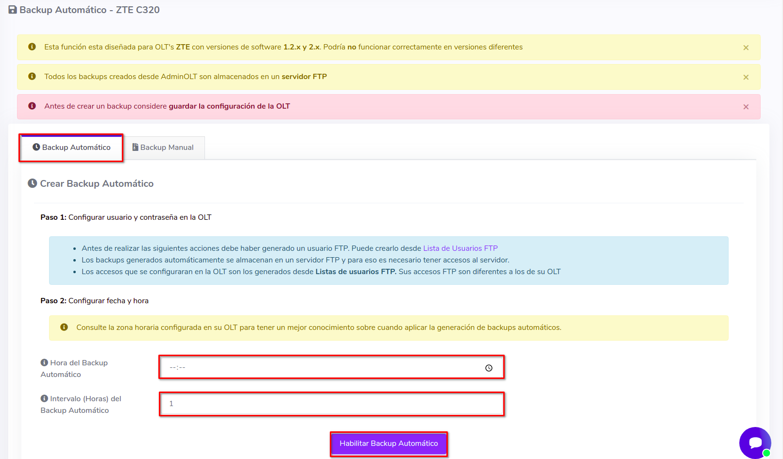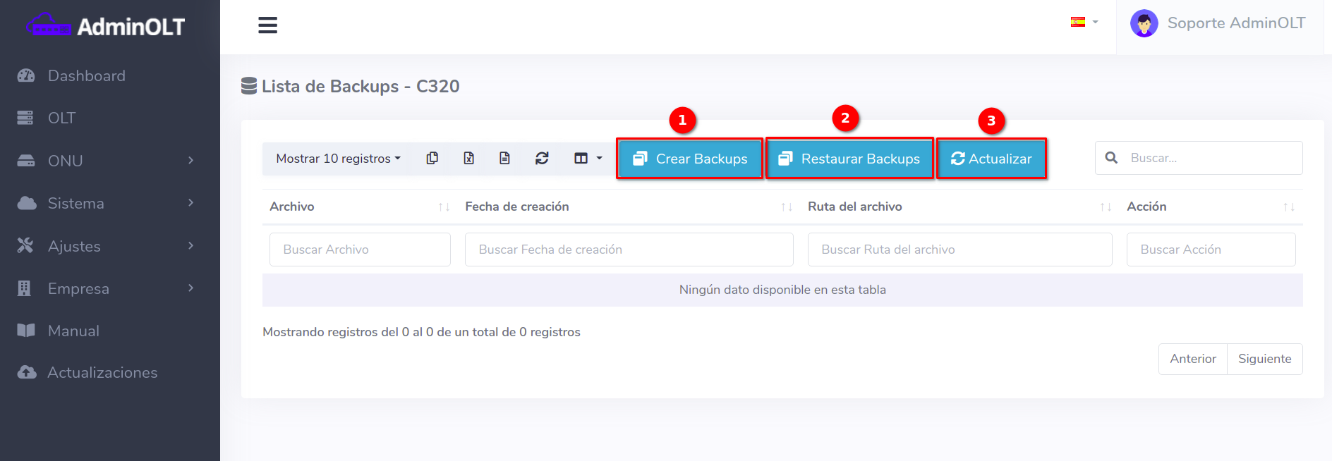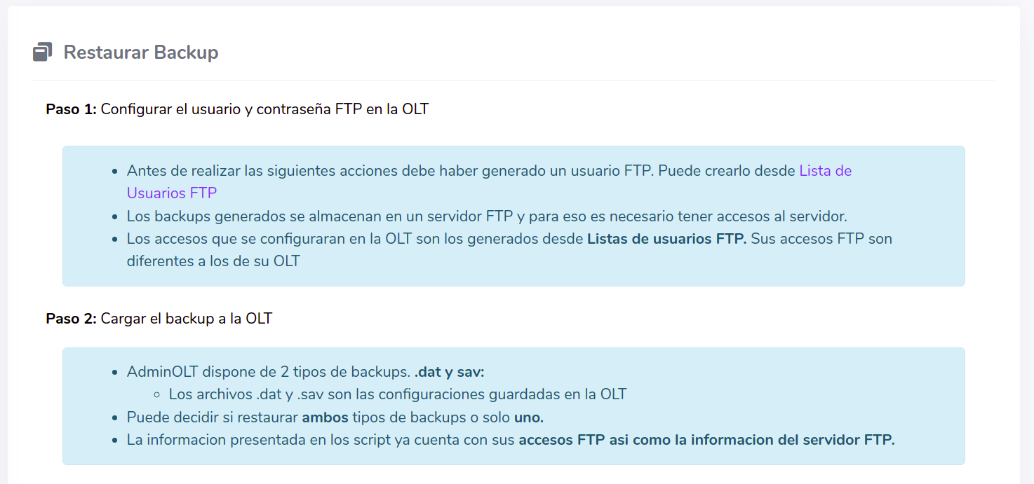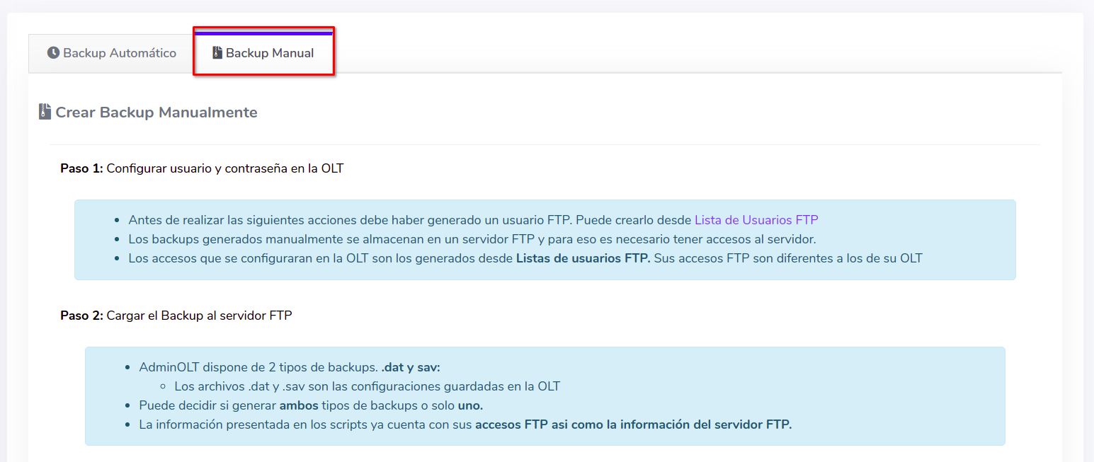 El sistema AdminOLT ofrece un acceso a un servidor FTP para el usuario. Esta información se configura en la OLT donde está última a base de los comandos específicos enviara la información al servidor antes mencionado. Si tiene dudas sobre como realizar este proceso, puede consultar el siguiente manual. Usuarios FTP