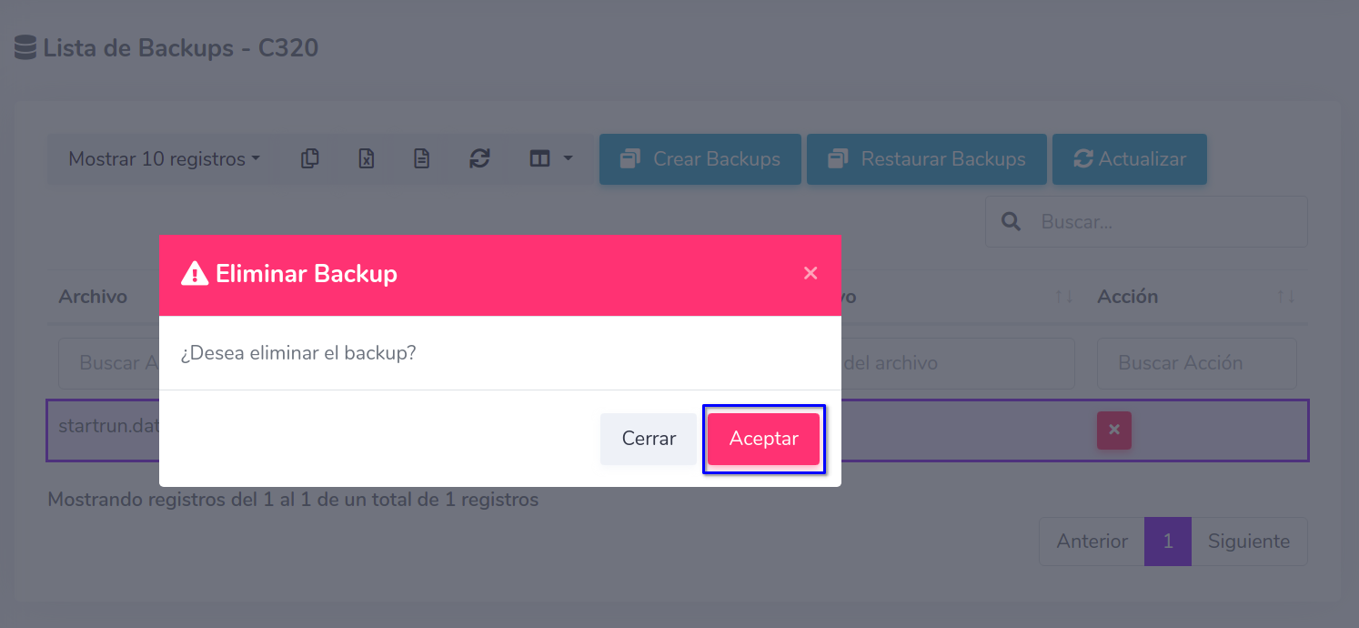 De click al botón con el símbolo X perteneciente al respaldo que desea eliminar