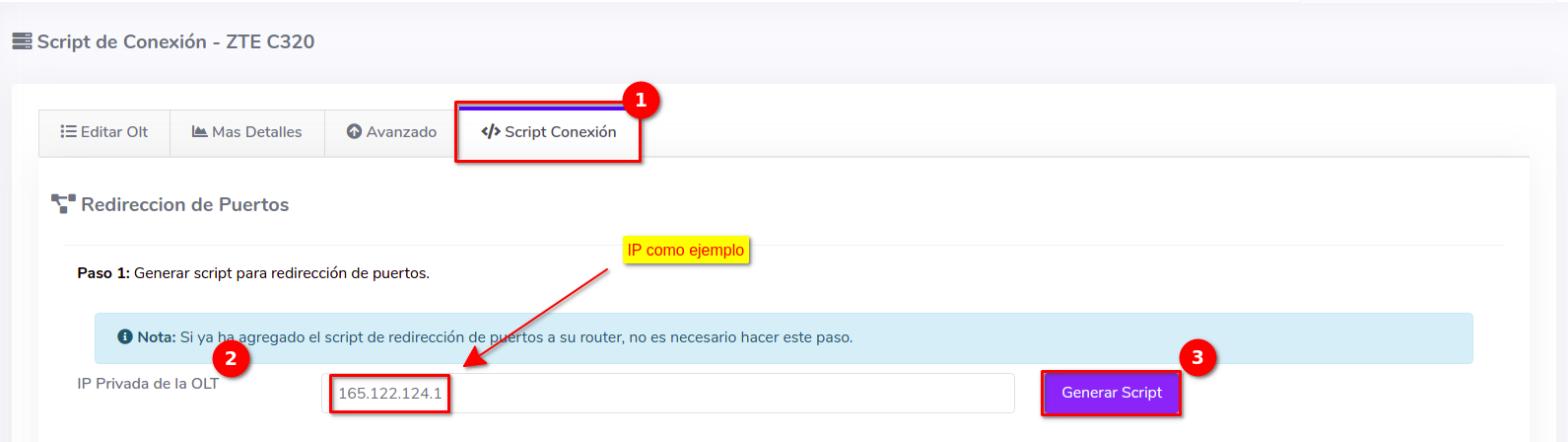 Recuerde usar las reglas adecuadas del Script de Conexión de AdminOLT con el fin de garantizar la conexión entre el servidor FTP y su OLT. Edite su OLT y en el apartado de Script de Conexión escriba la IP privada de su OLT para generar la información correspondiente.