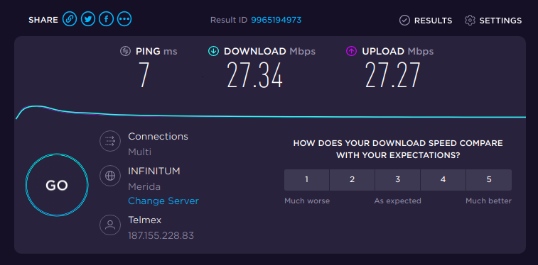 Si necesita consultar más a fondo si el cambio se aplicó en la ONU puede consultar el siguiente sitio SpeedTest, recuerde que debemos estar conectados a la ONU al medir la velocidad. Ejemplo del resultado: