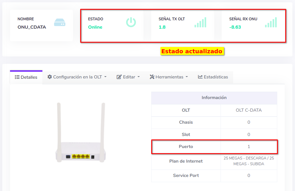 4Cambiar puerto físicamente y verificar el estado de la ONU