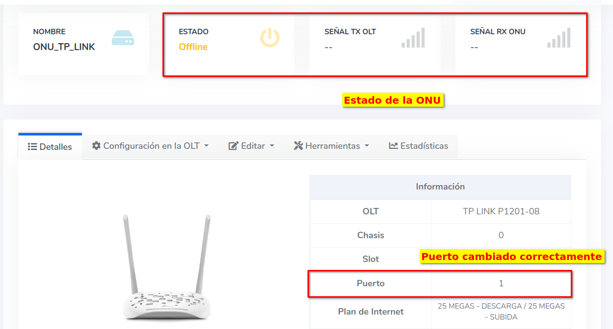 En este momento si vemos el estado de la ONU, este se encuentra en Offline debido a que físicamente no sé ha cambiado la ONU de Puerto, pero en AdminOLT si se ha actualizado la información.