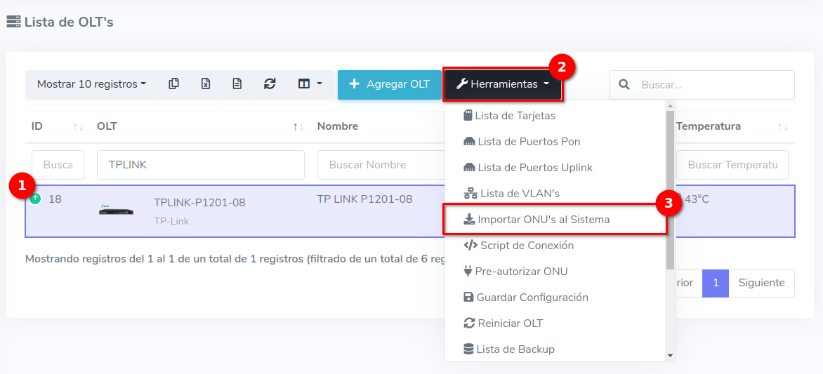1En la Lista OLT's seleccionamos el equipo con el que trabajaremos para después ir a Importar ONU's al Sistema, que se encuentra en el botón con la leyenda Herramientas.