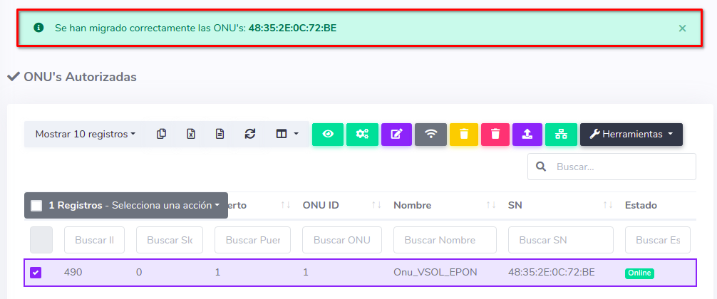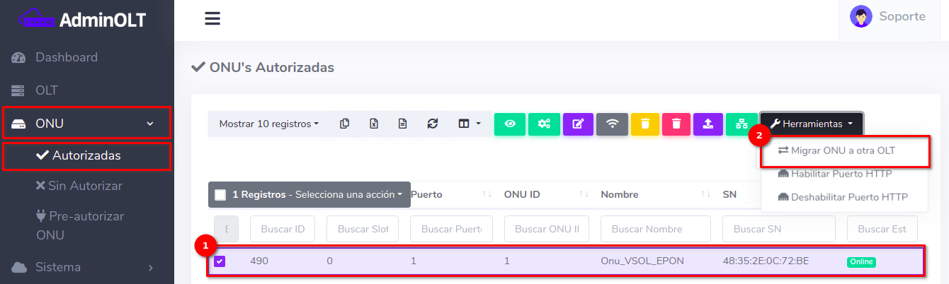 1 En ONU's > Lista de Onu's Autorizadas debemos escoger el equipo con el que se trabajará y seleccionar Migrar ONU a otra OLT que se encuentra en el botón con la leyenda Herramientas.