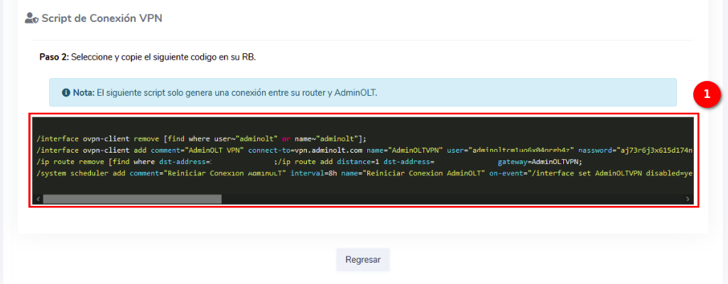 4 En la terminal de su Routerboard pegamos el script generado por AdminOLT y verificamos la conexión.