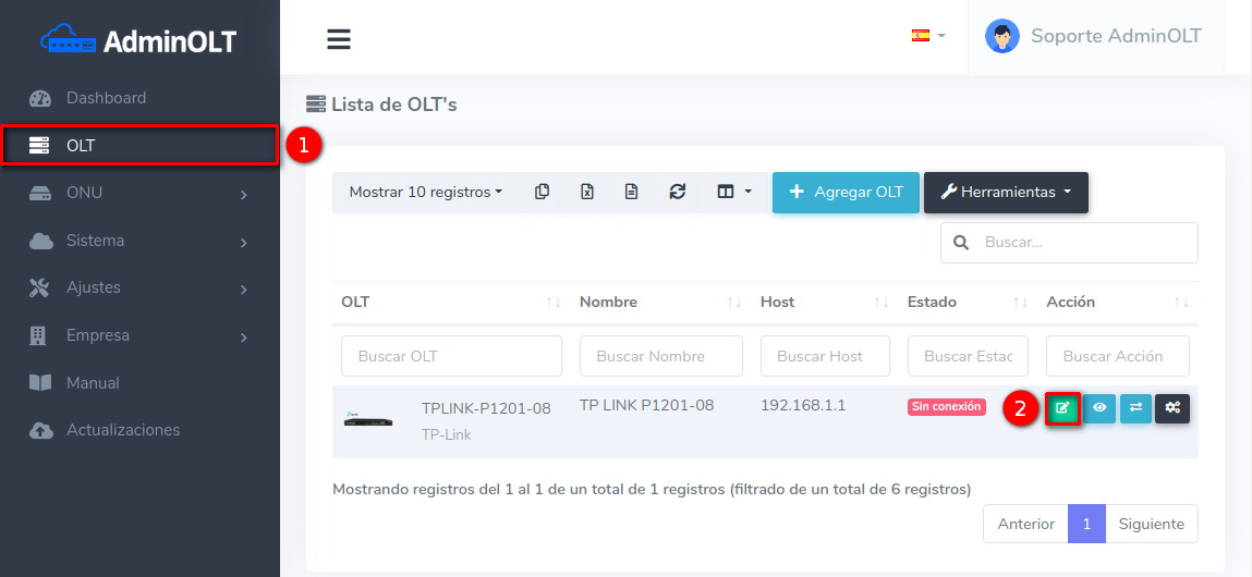 1 En la Lista de OLT's seleccionamos el equipo que deseamos conectar. La OLT ya debe estar registrada en AdminOLT.
