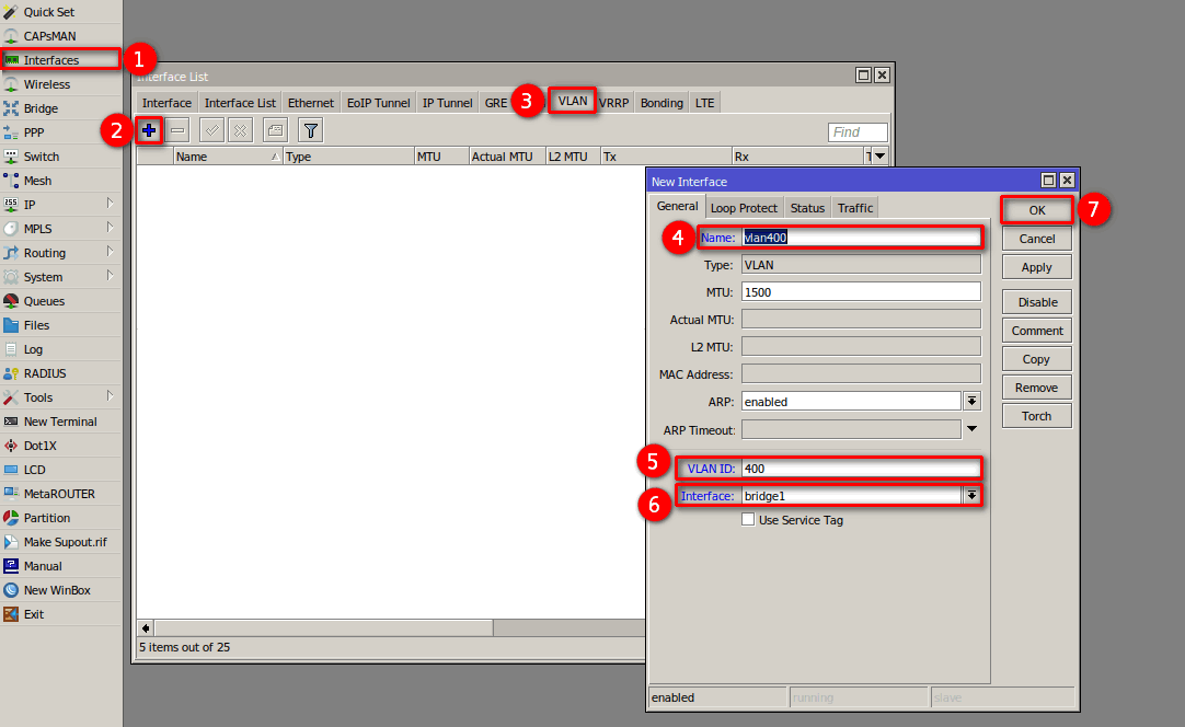 1 Nos dirigimos al apartado de Bridge en el menú de nuestro RouterBoard para crear la interfaz bridge1 y así poder agrupar los puertos que estarán trabajando en la red de la OLT.