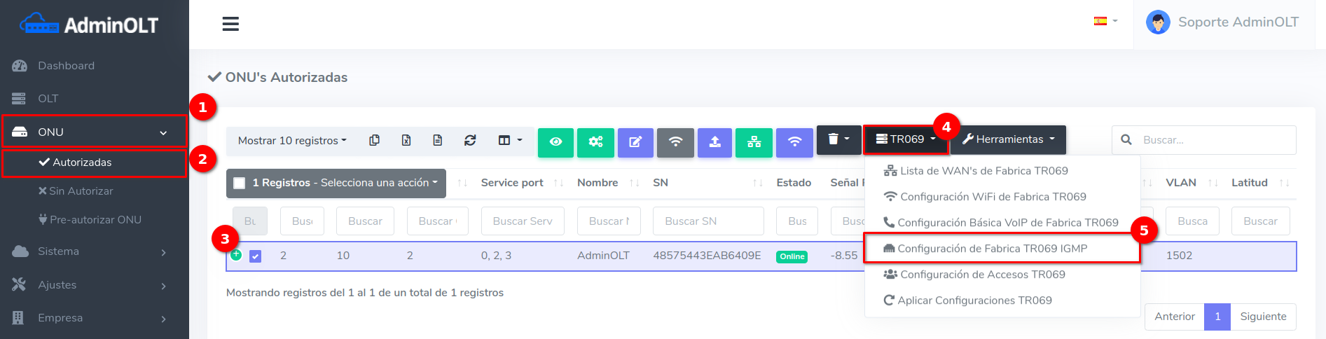 1Para poder agregar una Configuración IGMP, debemos dirigirnos a la sección ONU > Autorizadas. Seleccionamos la ONU con la que vamos a trabajar y damos click en el botón con la leyenda TR069 > Configuración IGMP TR069.