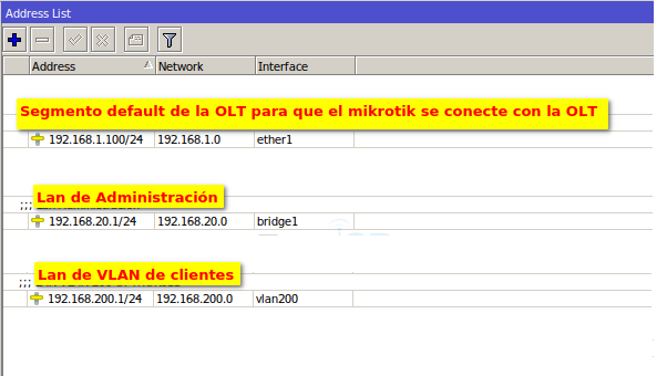 2 Debemos tener agregadas nuestro Vlan, LAN de Administración y LAN de Segmento de Clientes. Para más información puede leer el manual Configuración en RouterBoard MikroTik para OLT Optronics (Próximamente)