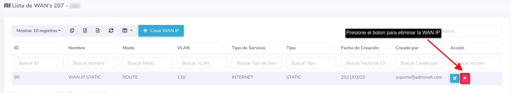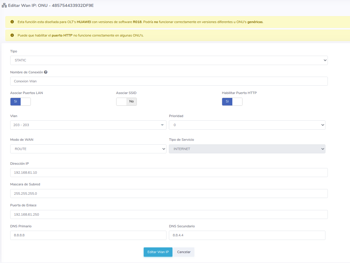 2Seleccione la opción Crear WAN IP y complete el formulario, con este proceso podrá autorizar y crear una WAN IP a una ONU al mismo tiempo.