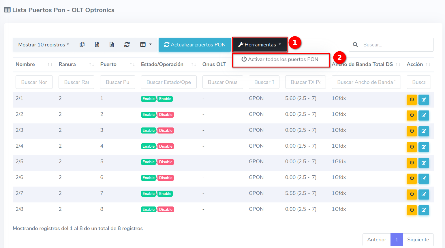 2 Estando en esta vista seleccionamos la opción Activar todos los puertos PON.