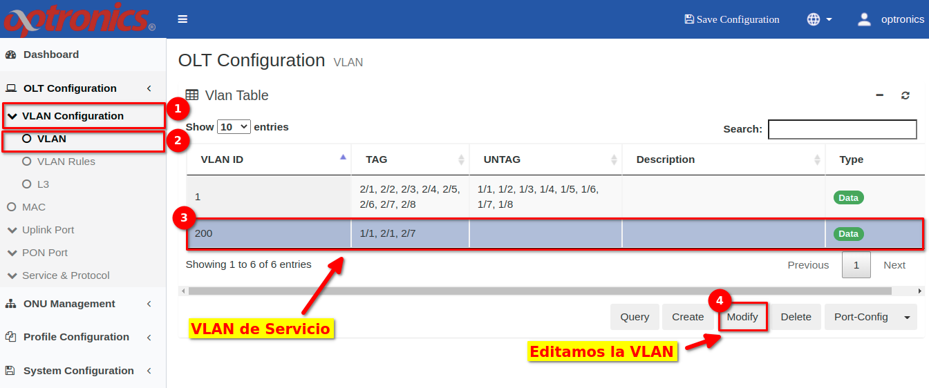Esta configuración aún no está disponible en AdminOLT, pero esto se puede hacer desde la interfaz de la OLT. Después de haber iniciado sesión, diríjase a la lista de VLAN y seleccioné la VLAN a editar.