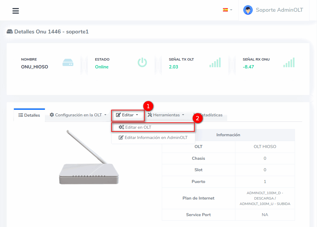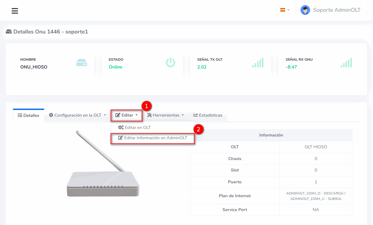 - Editar ONU en AdminOLT desde Detalles de ONU