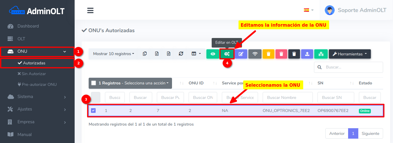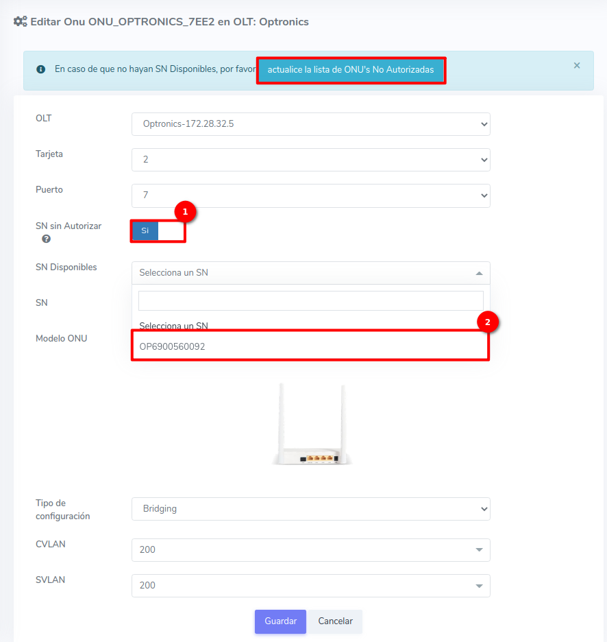Pasos para editar información de ONU Autorizada por SN