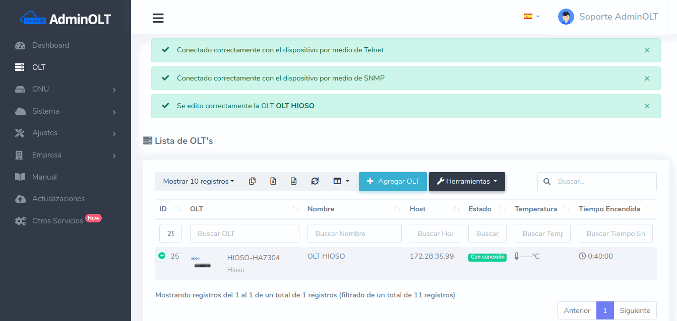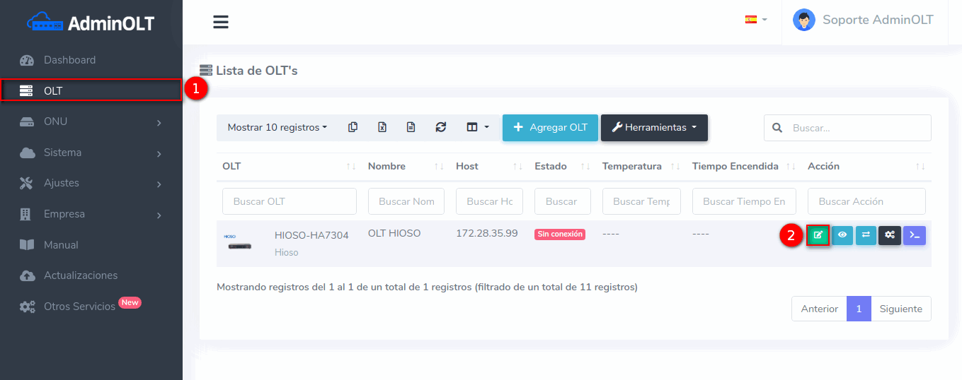 1 Para poder establecer la conexión de manera exitosa es necesario que generemos un script, para poder generarlo, nos dirigimos a nuestra OLT y seleccionamos la opción de editar.