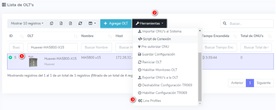 Vamos a Lista de OLT, en la barra de Herramientas seleccionamos la opción Line Profile
