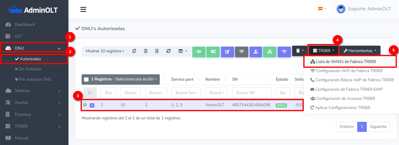 1Para poder agregar una WAN IP, debemos dirigirnos a la sección ONU > Autorizadas. Seleccionamos la ONU a la que vamos a agregar la WAN IP, damos Clic en TR069 > Lista de WAN's de Fabrica TR069.