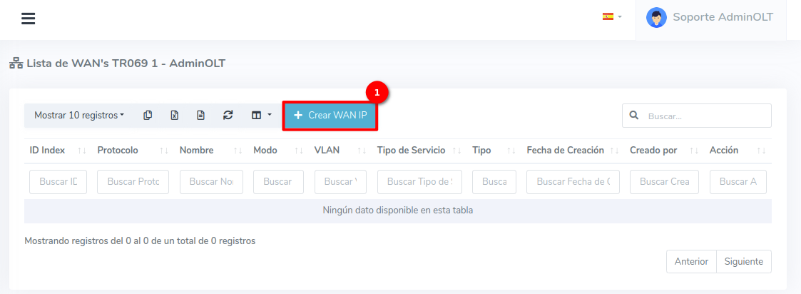 2Una vez en la Lista de WAN IP TR069 podemos agregar la WAN IP TR069 dando Click en el botón Crear WAN IP.