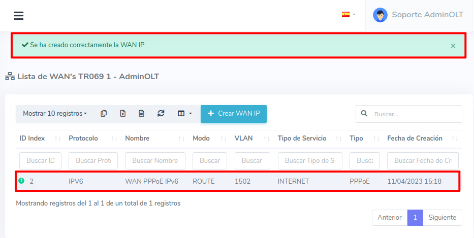 4Una vez guardado nos regresará a la Lista de WAN IP TR069 donde podremos ver un mensaje confirmando que se agregó correctamente.
